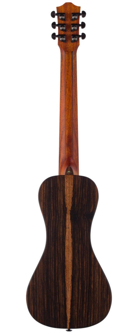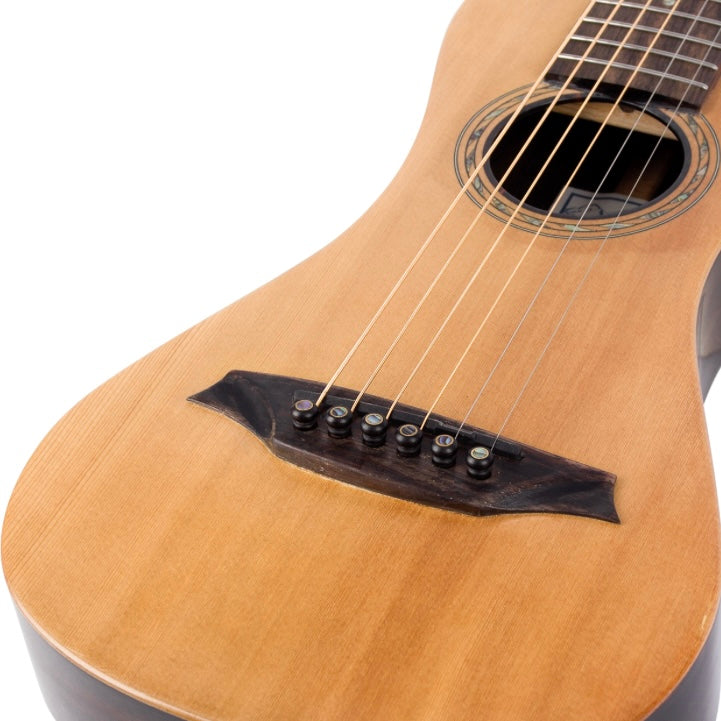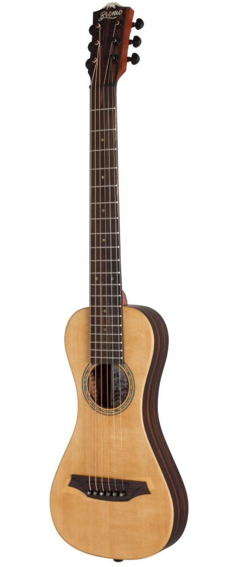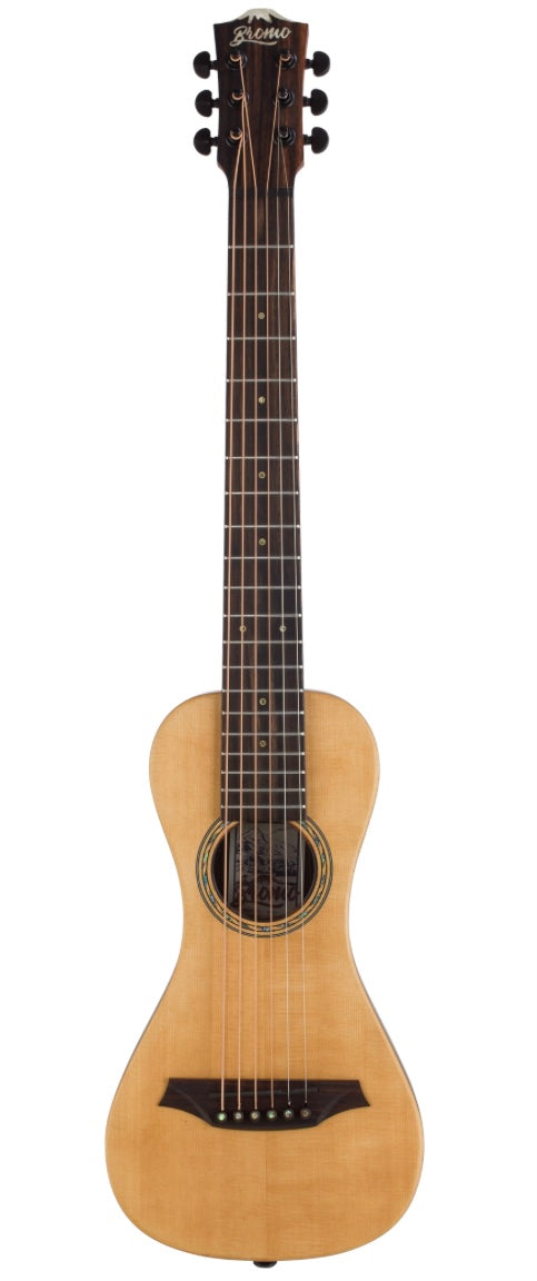 The Bromo BAR3 is an all-solid, travel-sized acoustic guitar. It features a solid Sitka spruce top, solid Amara ebony back and sides, and a mahogany neck with ebony reinforcement strips.The BAR3 is part of Bromo's Rocky Series and includes a dual-action truss rod, ebony fingerboard, and jumbo frets.