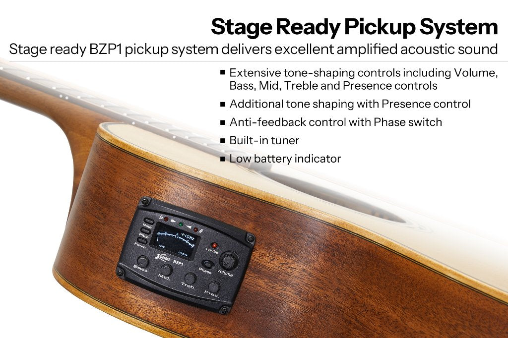 The Electric Acoustic models feature an under-saddle pickup and a three-band Bromo EQ with built-in tuner, ideal for live performance and recording.