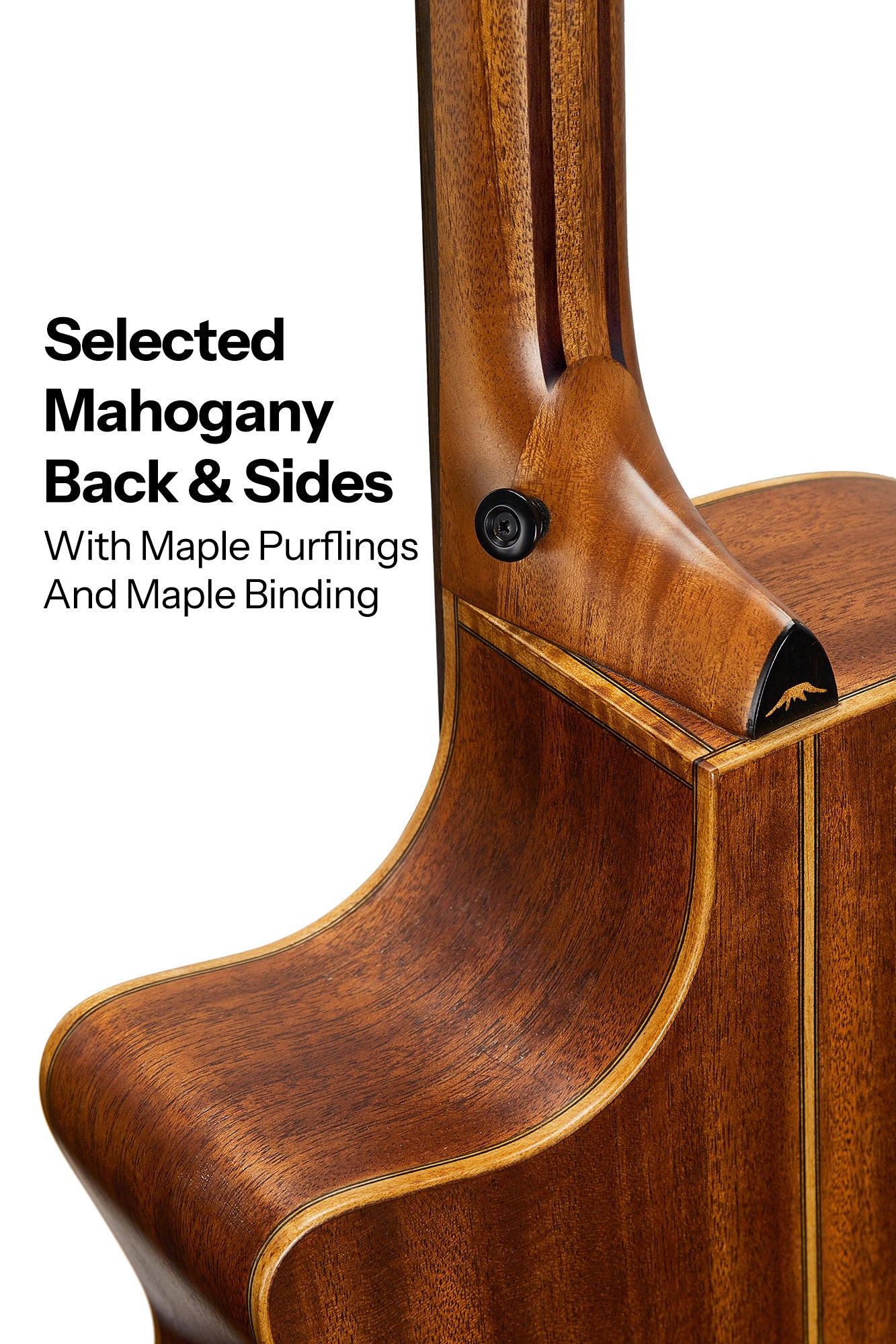 Tahoma Series features a solid top to deliver delicate tones. Solid Sitka spruce top models sport an articulate, clear tone and prolonged sustain while solid mahogany top models produce a relatively smoother and warmer hue. Patented ToneFlow bracing system is incorporated to help boost resonances and richness.