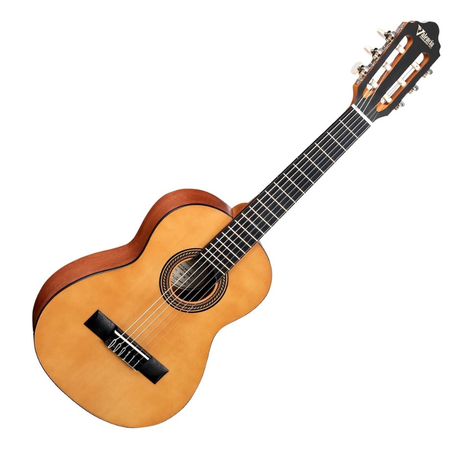 The Valencia VC201 is a 1/4 size classical guitar, designed for young beginners. It features a Sitka Spruce top, Nato back and sides, and a Jabon neck. The fingerboard and bridge are crafted from ebonized mahogany, and it has nickel-plated machine heads with cream buttons. The guitar has a satin finish.