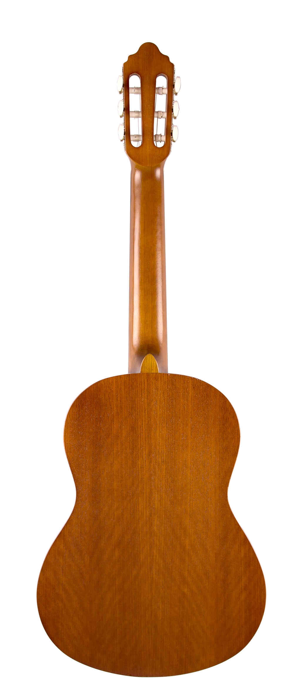 The Valencia VC202 1/2 size classical guitar features a Sitka spruce top, nato back and sides, and a jabon neck, providing a balanced tone. It has an ebonized mahogany fingerboard and bridge, and is finished with a see-through satin finish. The guitar has 19 brass frets, nickel-plated machine heads with cream buttons.