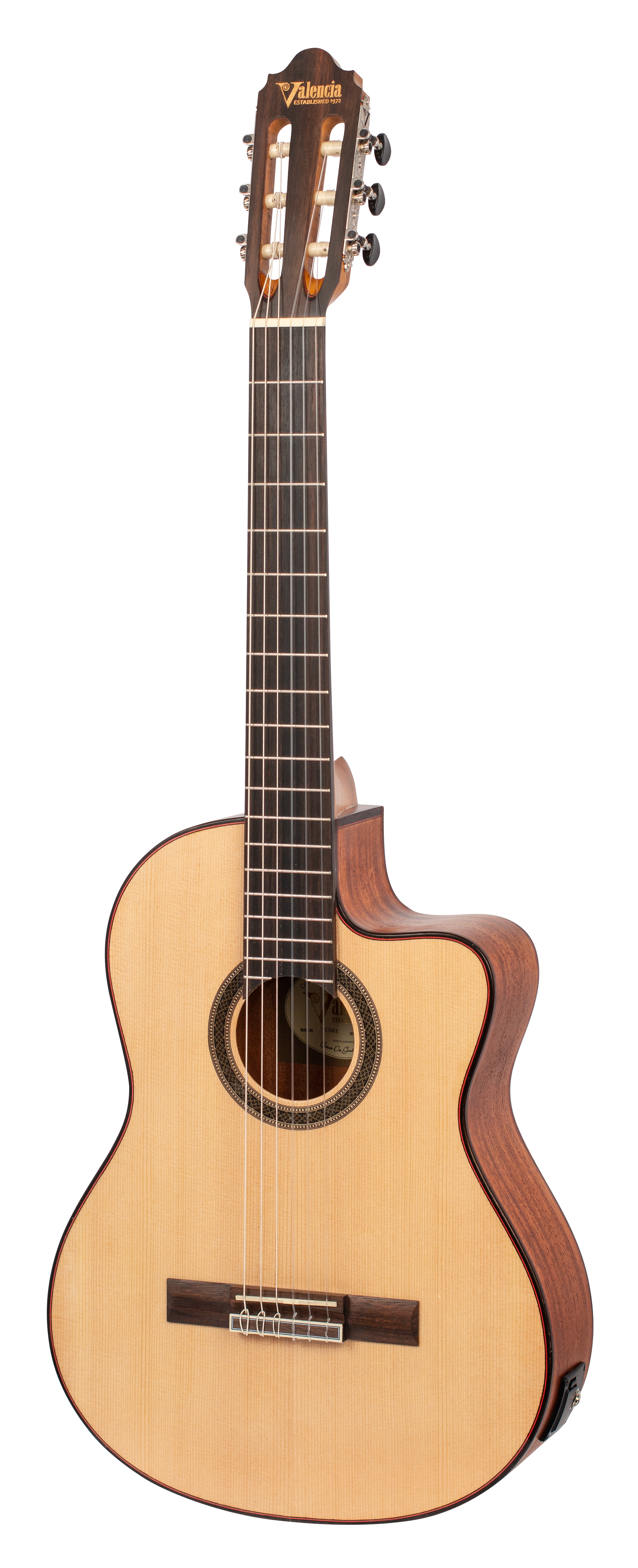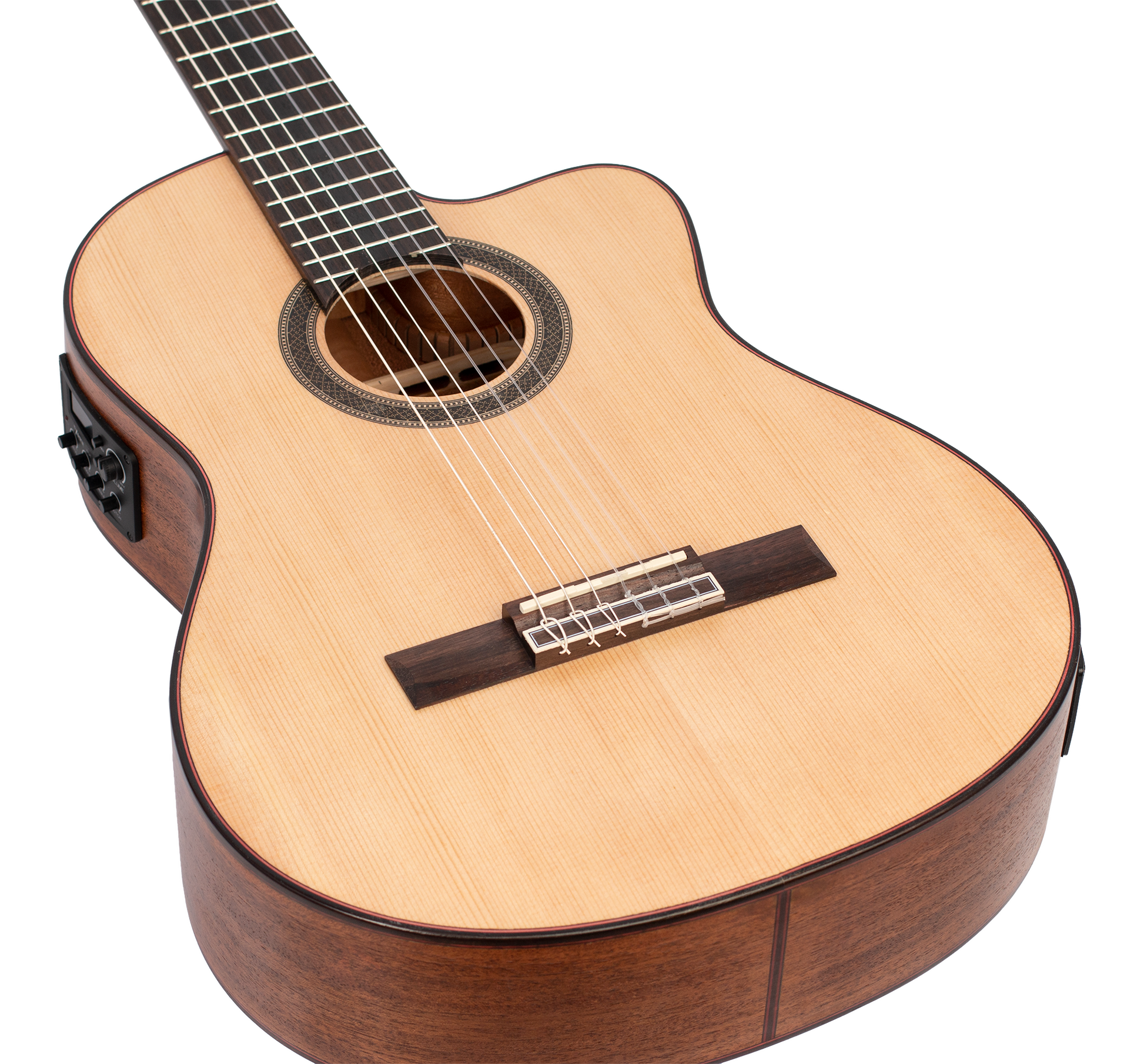 The Solid Sitka Spruce Top, with innovative ToneFlow bracing, gives this guitar an outstanding range that responds to your lightest touch with articulation and detail. Premium Mahogany back and sides enhance low-mid richness. A premium Mahogany neck and Amara Ebony fingerboard deliver exquisite playability. Other features such as exotic wood veneers, inlaid natural wood mosaic rosette and custom decorated machine heads result in a classical guitar that exceeds expectations in